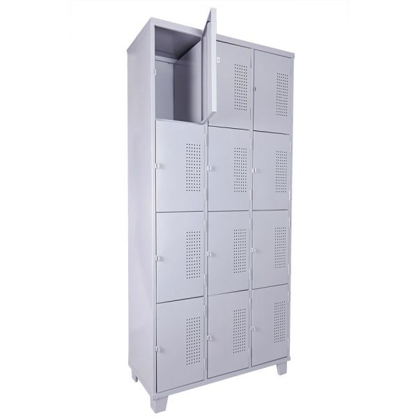 Roupeiro de Aço com 12 Portas Pequenas em “CHAPA 26” com Pitão para Cadeado, ideal para academias, supermercados, empresas e para uso em geral. Possui portas ventiladas e pés elevados.